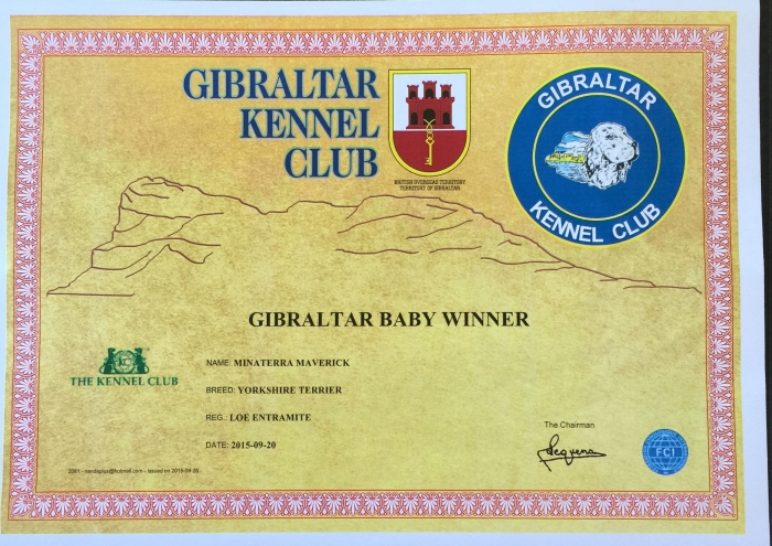 En la 42 & 43 Internacional Dog Show 2015 organizada por el Gibraltar Kennel Club, Minaterra MAVERICK , juzgado por los prestigiosos jueces. Mr. Lawrence Llamas y Mr. Desmond Murphi, obtiene la calificación: